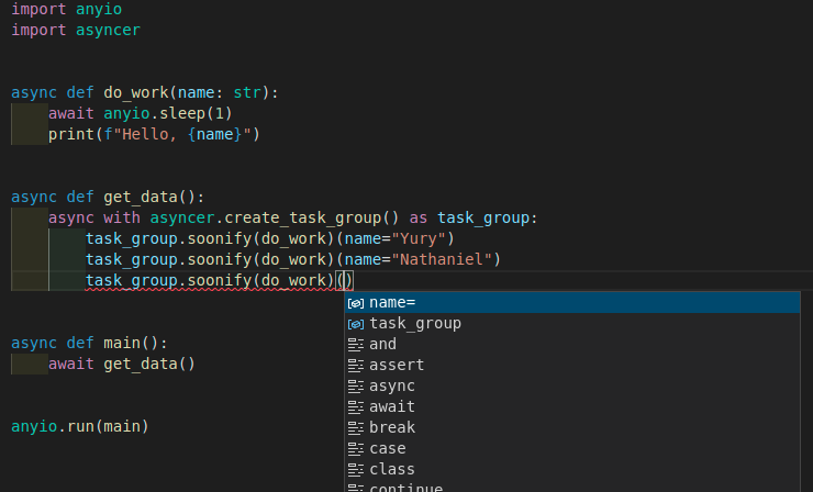 Now, because of the way Asyncer is designed, you will get typing support for your code.
